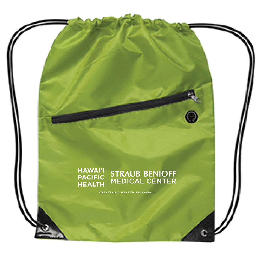 Polyester Drawstring Backpack with zippered front pocket and black adjustable drawstring closure, earbud port (earbuds not included). Size 47" x 13".