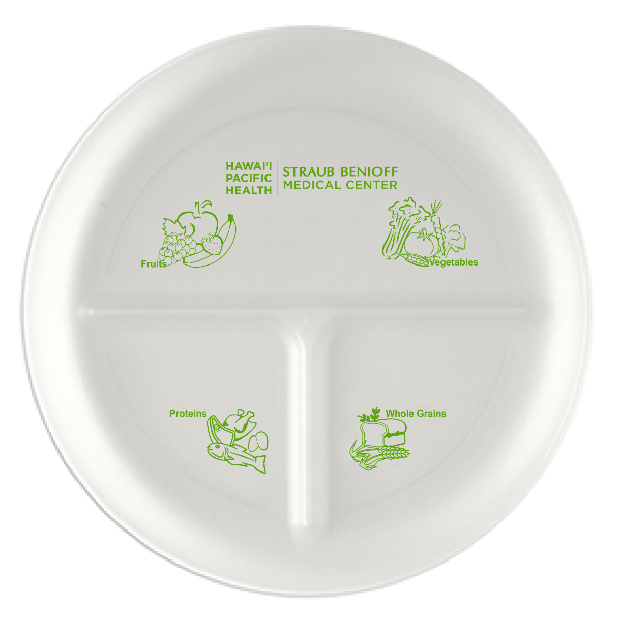 10" Food Grade Polypropylene plate has three compartments to help with portion control. Top rack dishwasher safe, imprinted with the Straub Benioff logo. Individually shrinkwrapped.