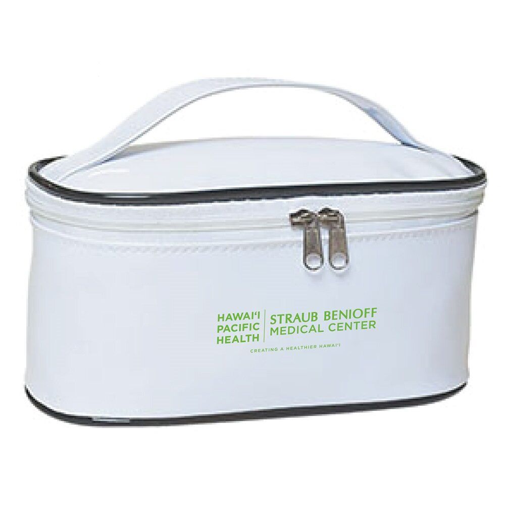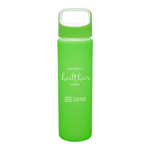 18oz Glass bottle with two-tone lid, carrying handle, and protective silicone sleeve. Hand wash recommended, Do not microwave. Imprinted with Straub Benioff Logo