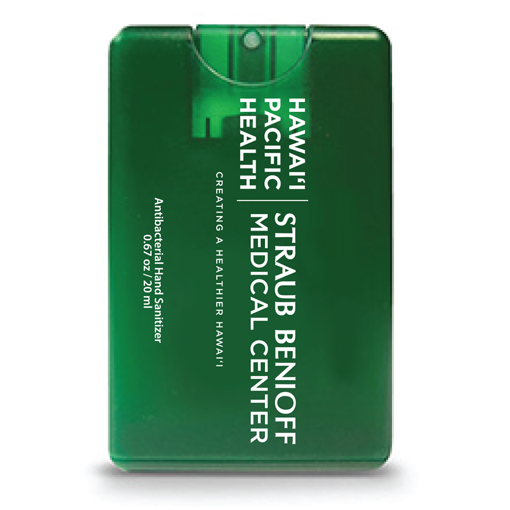 Credit Card Style Antibacterial Hand Sanitizer Spray. It has a citrus scent and measures 2.18" W x 3.42" H. Holds .67 oz or 20 ml and is FDA registered and approved. Imprinted with the Straub Benioff logo.