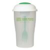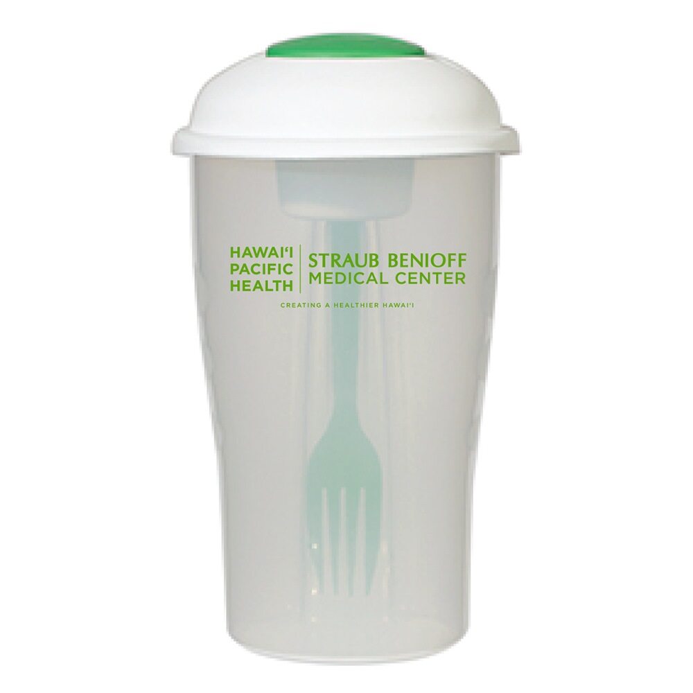 This three-piece salad shaker set holds up to 4 cups of salad. The fork slides into the white lid for convenient storage, and the removable dressing container nests in the lid and holds up to 4 tablespoons of dressing. Measuring 8", BPA free and meets FDA requirements. Hand washing is recommended. Imprinted with the Straub Benioff Logo.