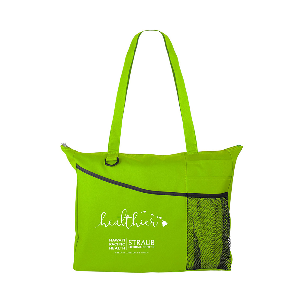 Conference tote! Measuring 15"W x 13"H x 4"D and available in several colors, this bold bag is made of 600-denier polyester and features a D-ring on the front with a large slip pocket, two card pockets, a mesh water bottle holder, an interior zippered security pocket, a zippered closure, and 26" handles.