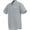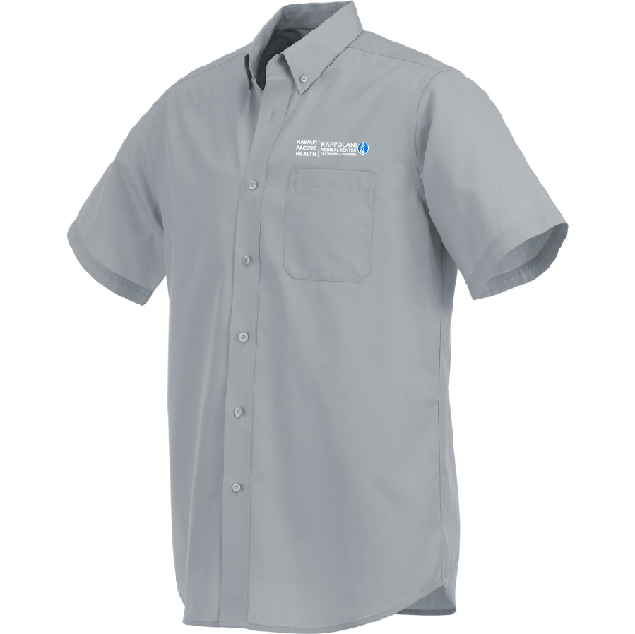 Men's short sleeve button down shirt 65% polyester, 35% cotton poplin woven fabric blend with Kapi'olani logo embrodiered on left chest above upper patch pocket.