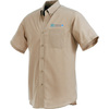 Men's short sleeve button down shirt 65% polyester, 35% cotton poplin woven fabric blend with Kapi'olani logo embrodiered on left chest above upper patch pocket.