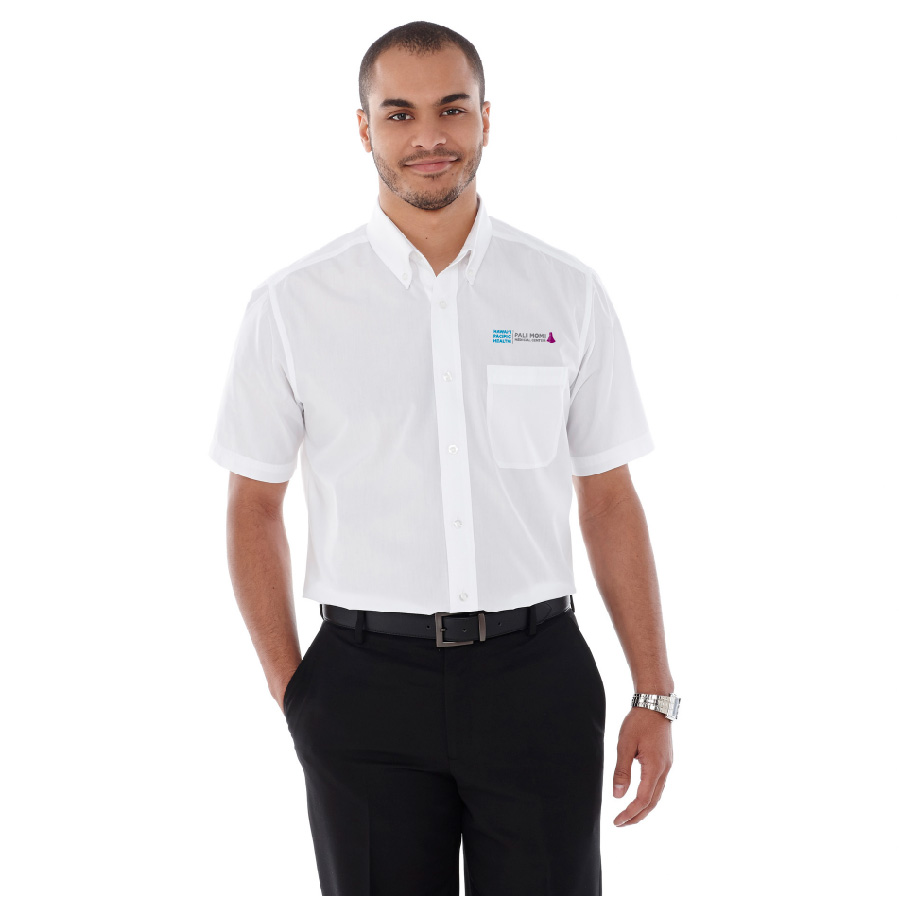 Men's short sleeve button down shirt 65% polyester, 35% cotton poplin woven fabric blend with Pali Momi logo embrodiered on left chest above upper patch pocket.