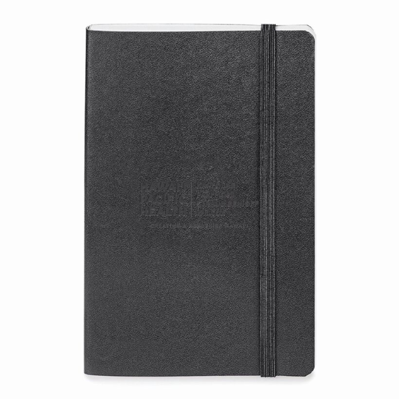 Soft Suede Journal with 96 ivory lined acid-free pages, and a little gusseted pocket on the inside for business cards, receipts or other notes. Black cover with matching elastic closure; Debossed with Hawaii Pacific Health Logo
