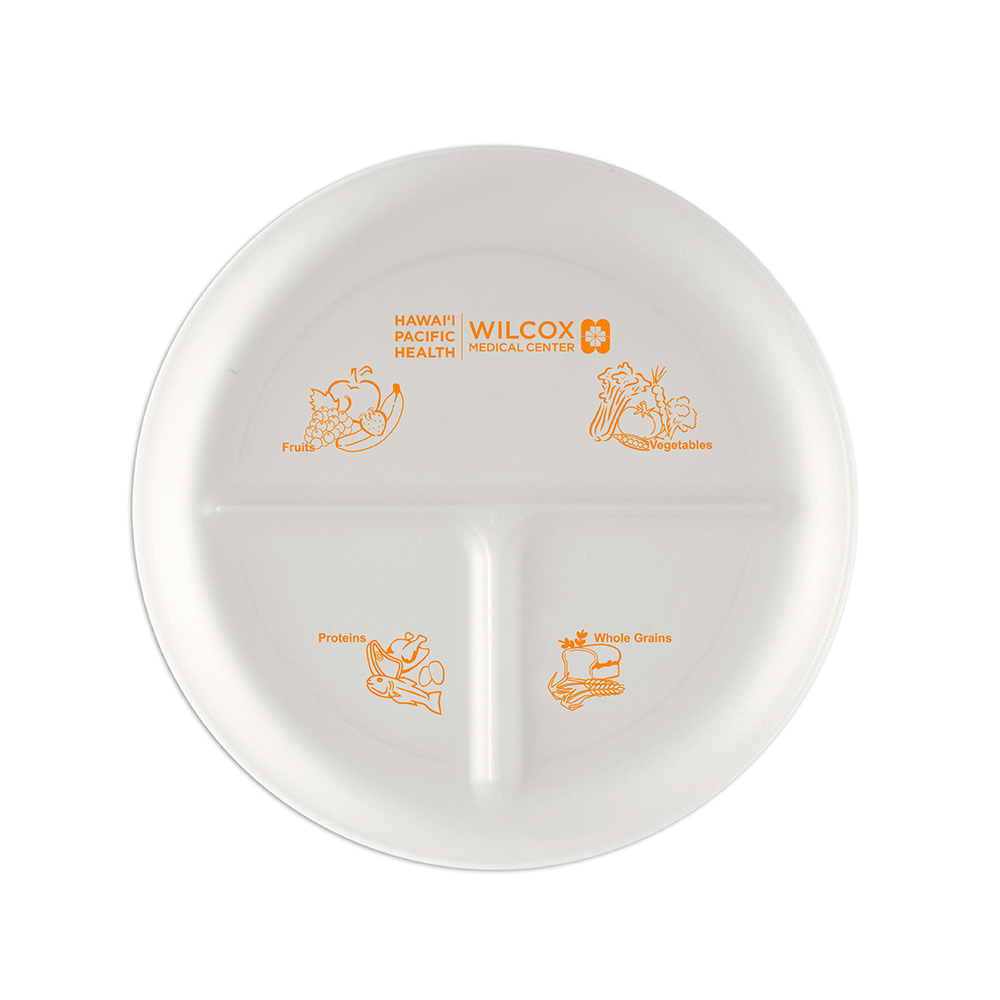 10" Food Grade Polypropylene plate has three compartments to help with portion control. Top rack dishwasher safe, imprinted with the Wilcox logo. Individually shrinkwrapped.