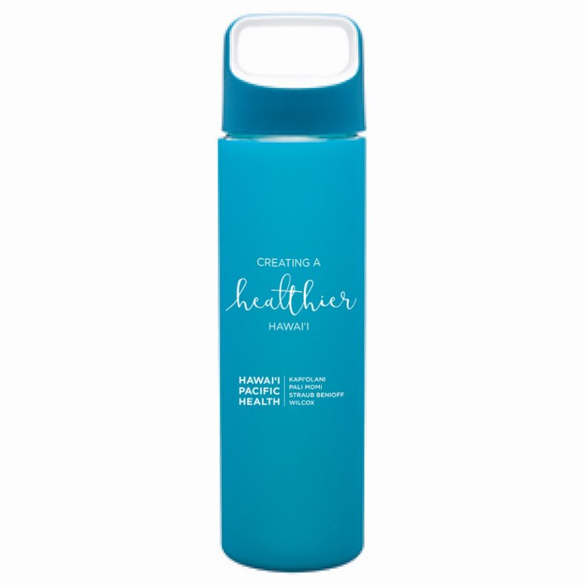 18oz Glass bottle with two-tone lid, carrying handle, and protective silicone sleeve. Hand wash recommended, Do not microwave. Imprinted with Hawaii Pacific Health Logo