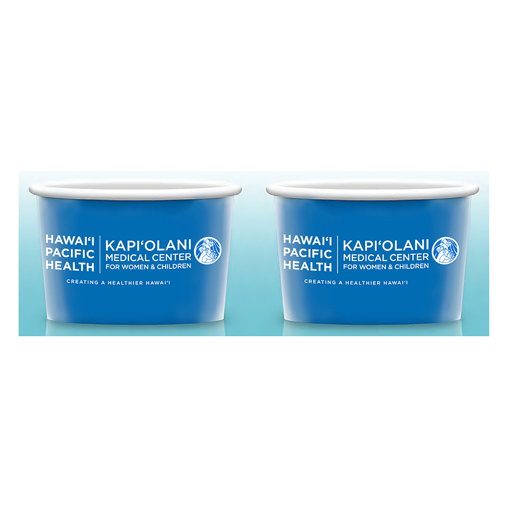 5 oz Reusable white plastic container , made with Polypropylene plastic, dish-washer safe, Full color wrap Kapi'olani Logo