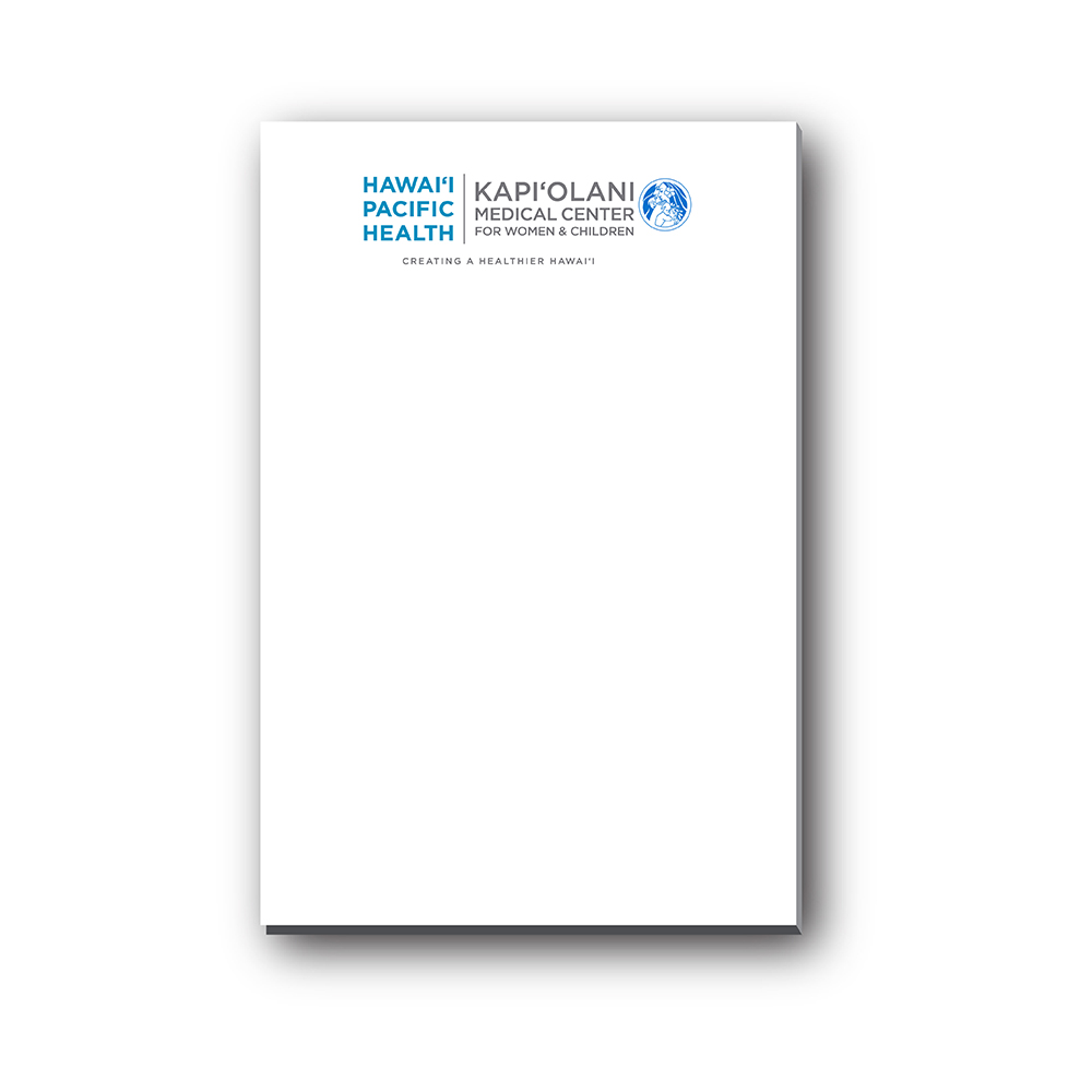 Large; 6" x 9" adhesive notepad; Optional Free ruled lines or non-dated weekly calendar grid; 25 Sheets per pad, individually imprinted with Kapi'olani Logo