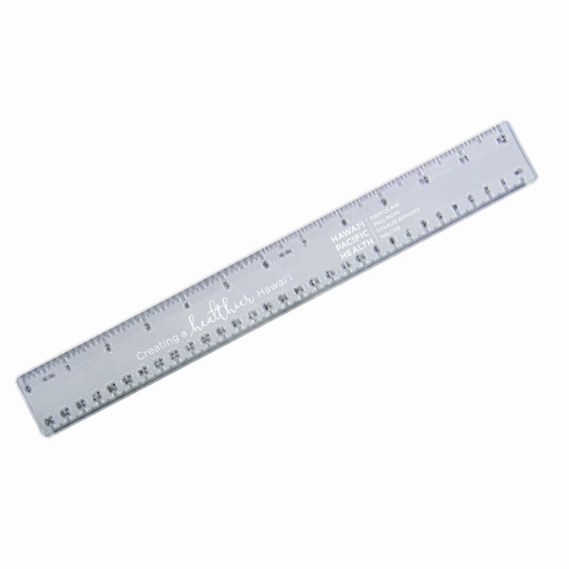 12" Flexible Clear Ruler; Standard 12 inch measurement on one side and 30 centimeter measurement on the opposite side; imprinted with the Hawaii Pacific Health Logo