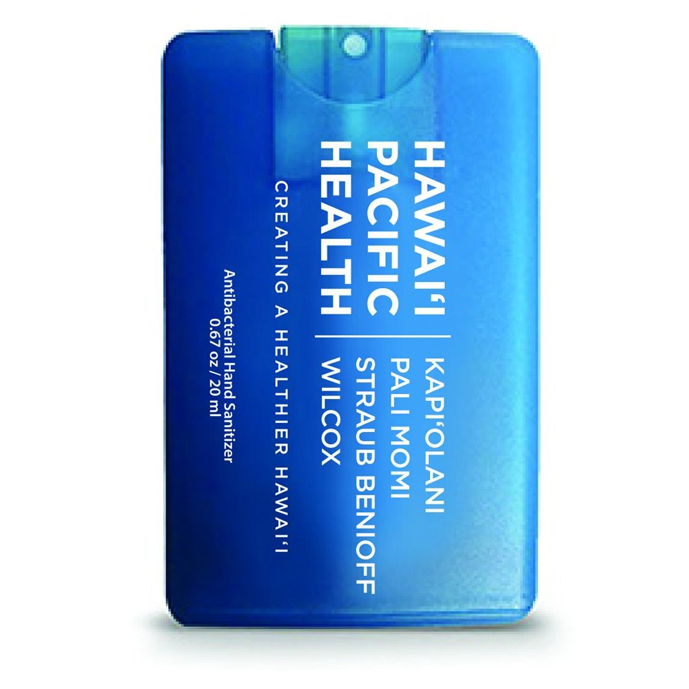 Credit Card Style Antibacterial Hand Sanitizer Spray. It has a citrus scent and measures 2.18" W x 3.42" H. Holds .67 oz or 20 ml and is FDA registered and approved. Imprinted with the Hawaii Pacific Health logo.