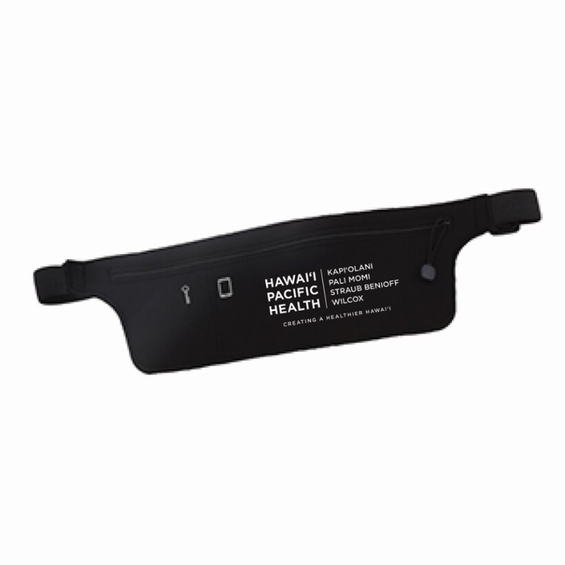 Neoprene running belt with two pockets. Measures 13" x 4"; Imprinted with the Hawaii Pacific Health Logo