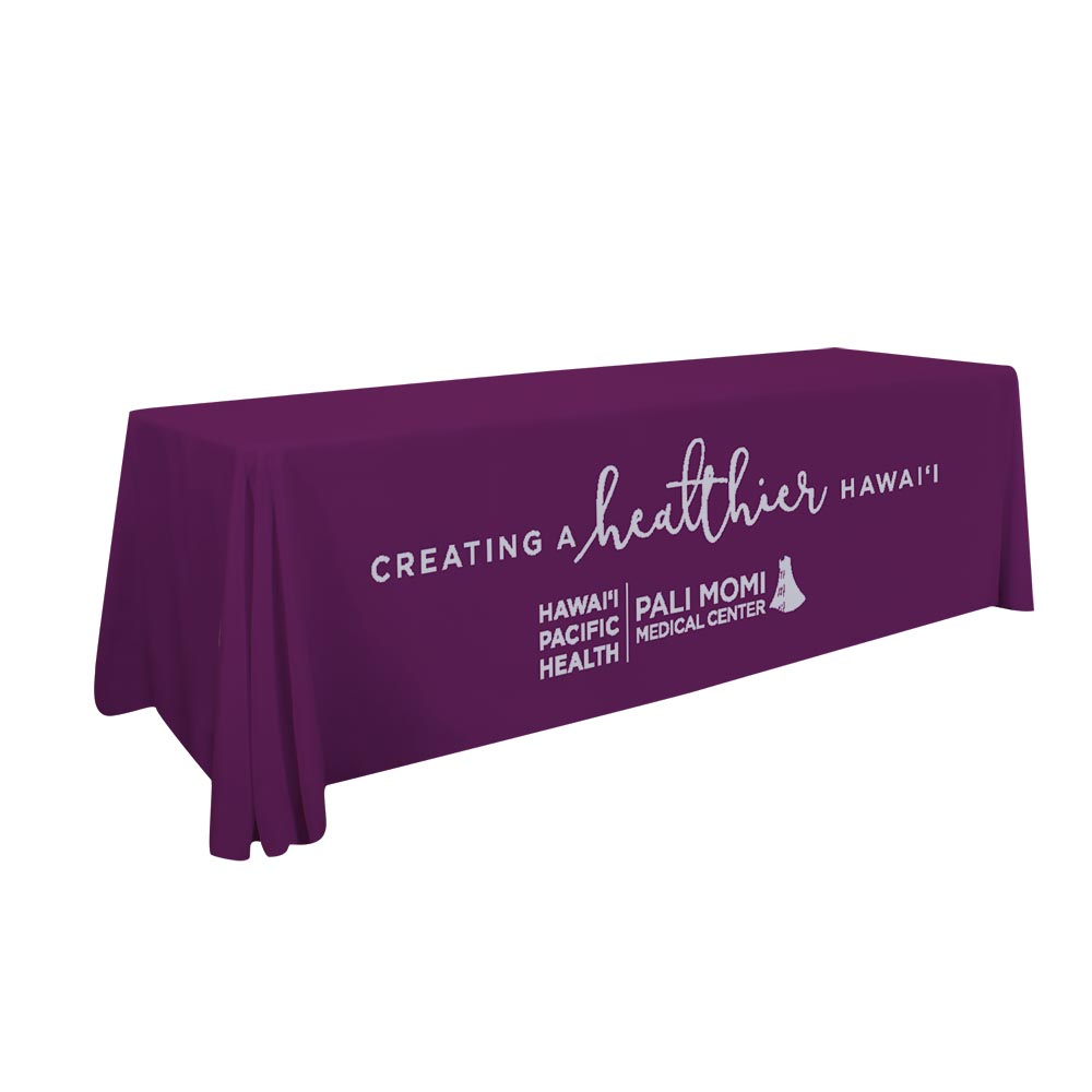 8' standard table throw. Flame retardant, premium polyester poplin fabric. Machine washable and wrinkle resistant. Compliance with the National Fire Protection Association Standard No. 701. Care instructions: Recommended for indoor use only. Do not iron. Do not dry clean. Imprinted with the Pali Momi Logo