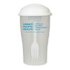 This three-piece salad shaker set holds up to 4 cups of salad. The fork slides into the white lid for convenient storage, and the removable dressing container nests in the lid and holds up to 4 tablespoons of dressing. Measuring 8", BPA free and meets FDA requirements. Hand washing is recommended. Imprinted with the Hawaii Pacific Health Logo.