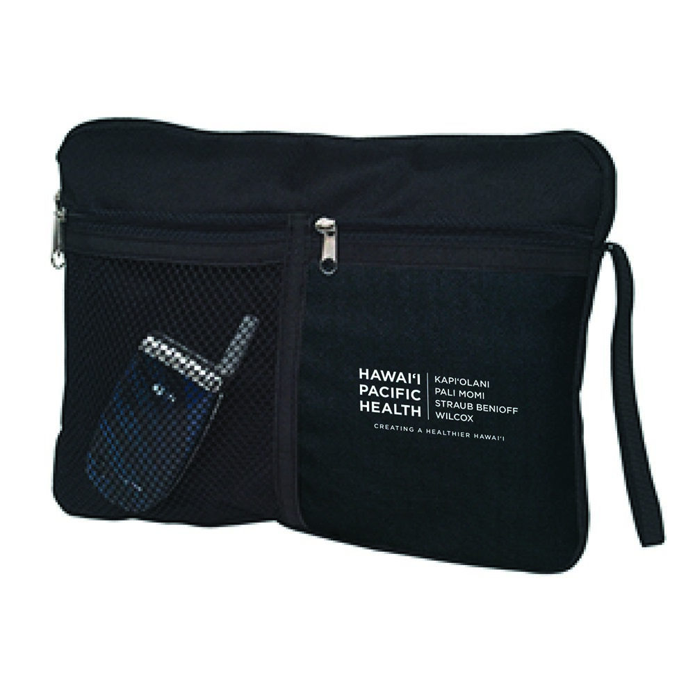 Multi-purpose personal carrying polyester bag with a front mesh pocket for your ID or cellphone, several zippered compartments and a convenient carrying strap, measures 10" x 8" x 1 1/4" . Spot clean/air dry.