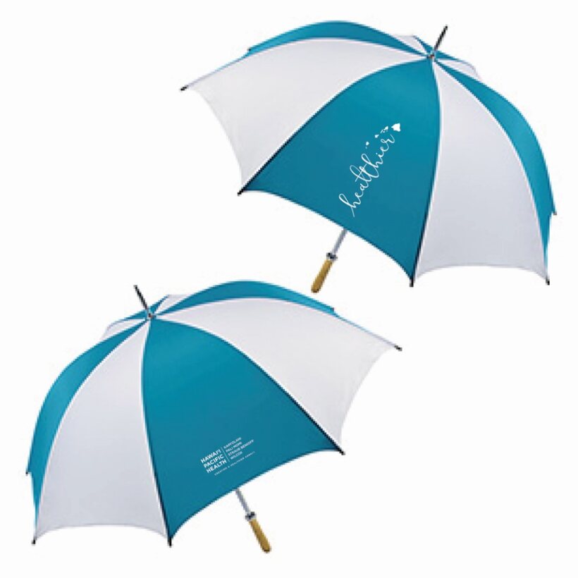 Umbrella with 60" arc, features double ribbed frame, metal shaft and wooden handle. 39.5" overall length. Imprinted with the Hawaii Pacific Health logo.