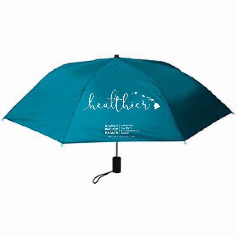 Umbrella with 40" arc, auto open folding umbrella. Features double ribbed frame, metal shaft and plastic grip handle with carrying strap. Folds to 15'. Imprinted with the Hawaii Pacific Health logo. Imprinted with the Hawaii Pacific Health logo.