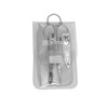Approximate size of 2 3/4" x 4 3/8", this kit includes scissors, a nail clipper, nail file and tweezers.