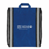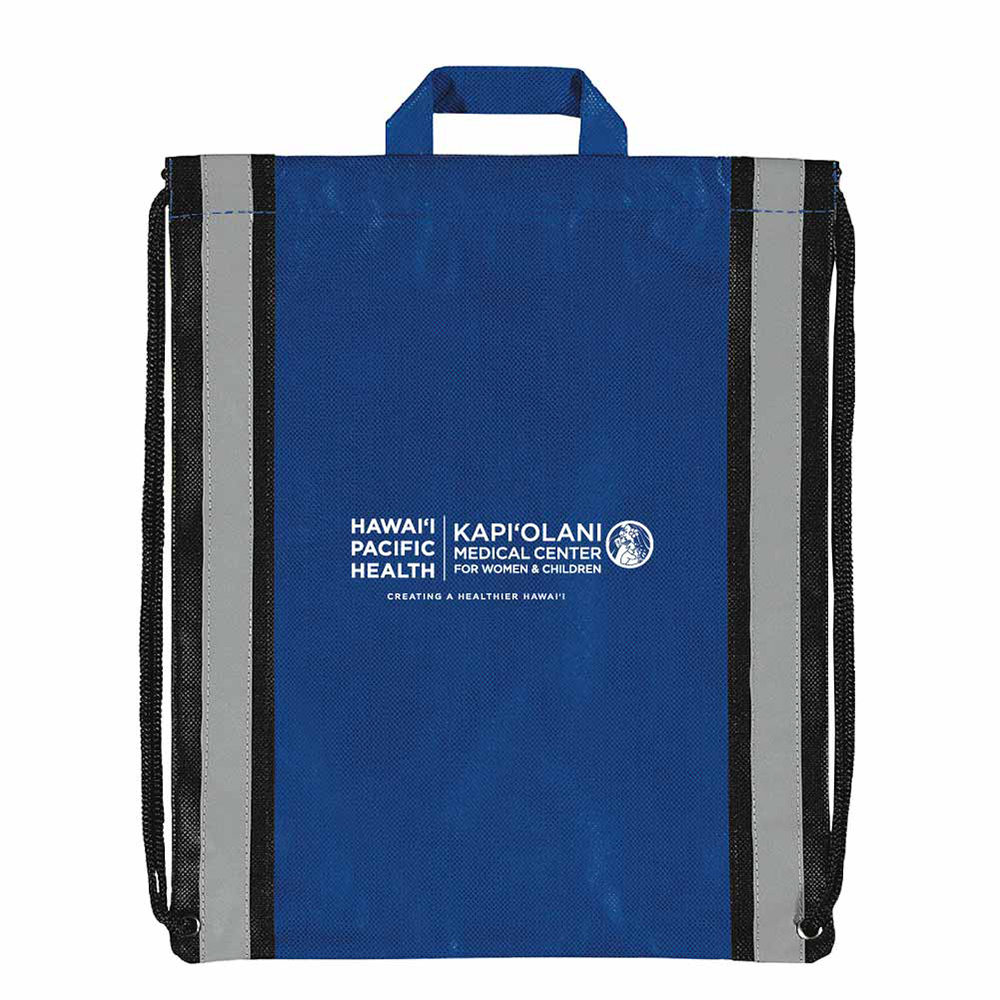 80 GSM premium non-woven polypropylene containing 20% post-industrial recycled content, string backpack with 1" reflective stripes, black draw cords, reinforced corner grommets, and carrying handle.