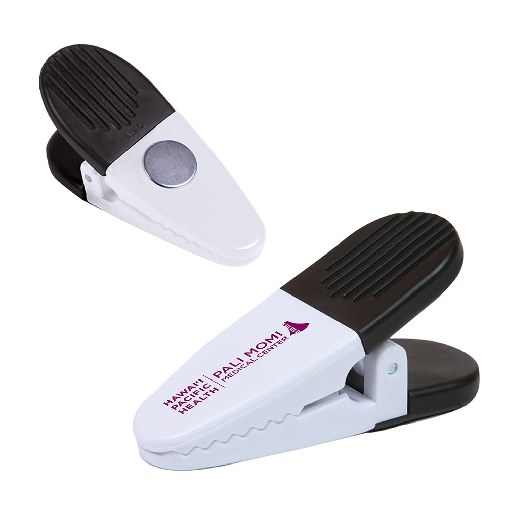 Jumbo magnetic memo clip! Measuring 3 1/2" x 1 1/4" x 1 3/4" Made of PS plastic and has a spring-loaded mechanism. It features ribbed plastic "teeth" for a superior hold, a durable rubber grip and an extra-strong magnet on the back.